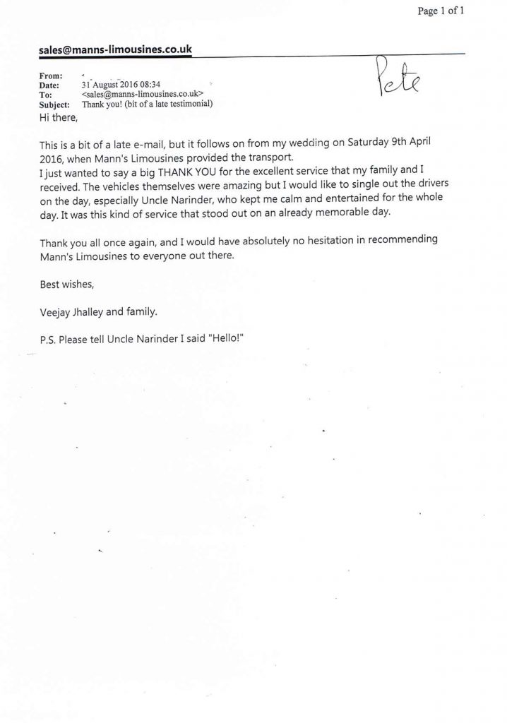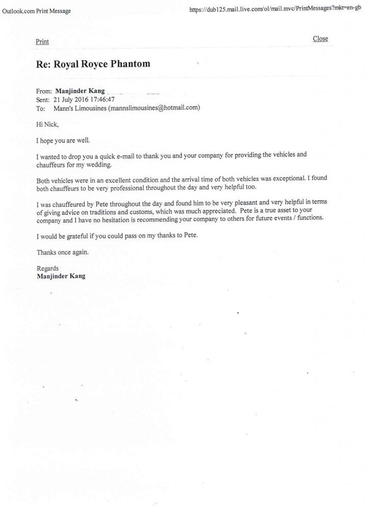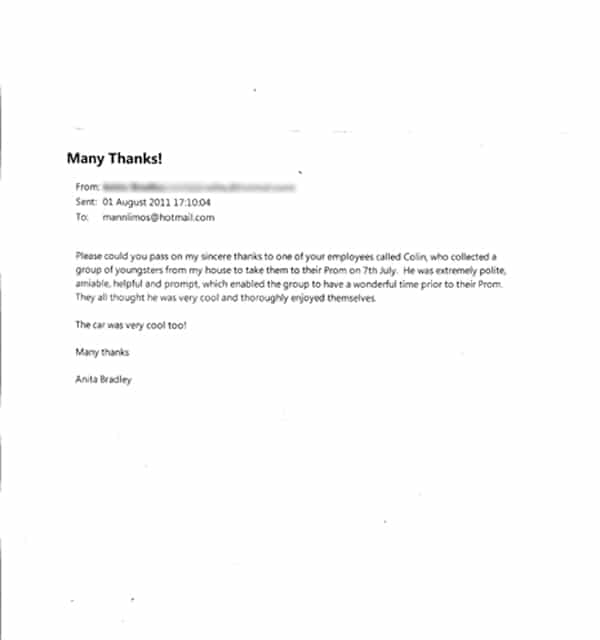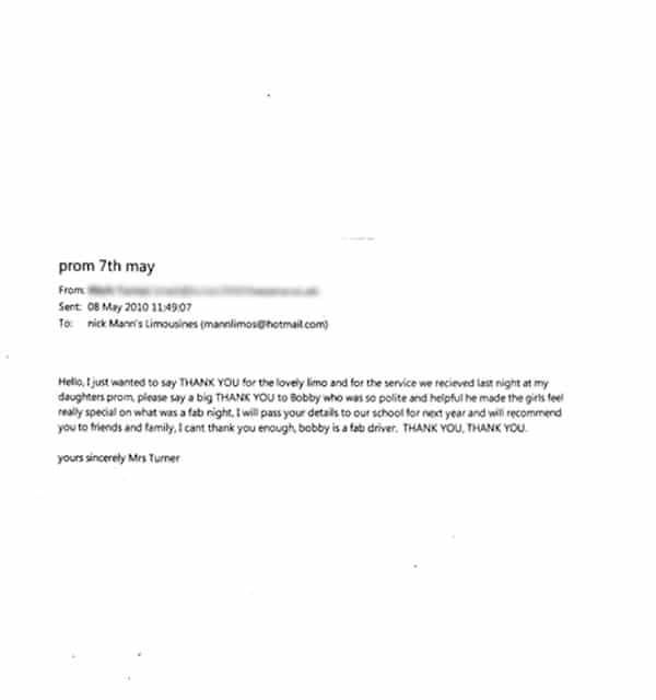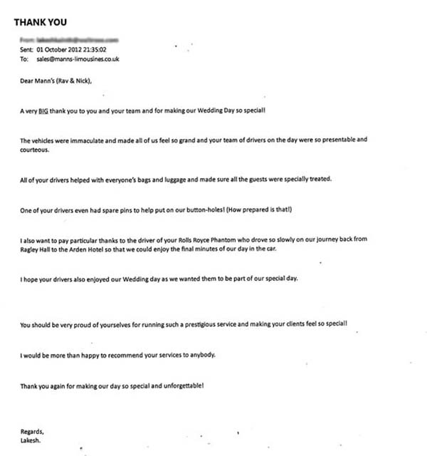 Limousine Hire Testimonials Mann's has an enviable reputation for providing excellent service. But don't just take our word for it... What Our Clients Say About Us